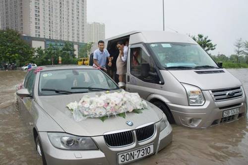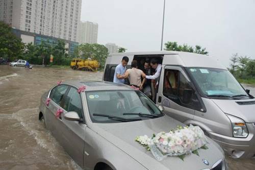 Tại Km5+200 Lê Trọng Tấn, An Khánh, Hoài Đức (Hà Nội), chúng tôi đã ghi nhận được một câu chuyện cực kỳ hi hữu. Cặp cô dâu chú rể Kim Thoa-Minh Hùng đã có một kỉ niệm "nhớ đời" khi chiếc xe rước dâu đi đến khu vực này bị chết máy giữa biển nước mênh mông.