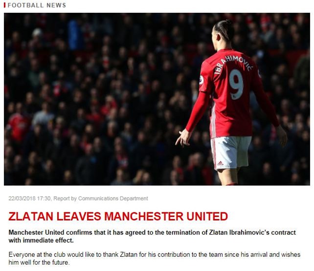 Trang chủ Man Utd xác nhận, BLĐ Manchester United đã đồng ý giải phóng hợp đồng với Ibrahimovic. Tiền đạo 37 tuổi trở thành cầu thủ tự do và đích đến tiếp theo nhiều khả năng sẽ là giải nhà nghề Mỹ. Một số nguồn tin khẳng định, Zlatan sẽ hoàn tất thủ tục để khoác áo LA Galaxy ngay trong tuần này.