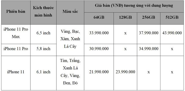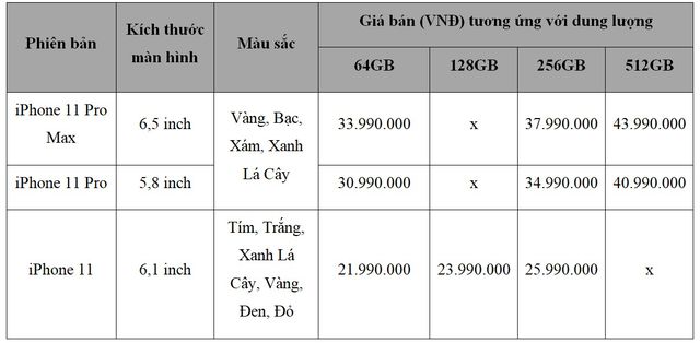 Phiên bản iPhone 11 Pro dự kiến sẽ có mức giá khởi điểm 30,99 triệu đồng cho tùy chọn bộ nhớ 64GB và 40,99 triệu đồng cho tùy chọn bộ nhớ cao nhất, 512GB. Các phiên bản tương tự của iPhone 11 Pro Max sẽ có giá lần lượt 33,99 triệu đồng và 43,99 triệu đồng.