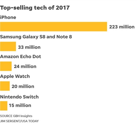 Theo công ty nghiên cứu thị trường GBH Insights, iPhone là sản phẩm công nghệ được tiêu thụ nhiều nhất trên toàn thế giới trong năm qua. Với hơn 223 triệu thiết bị bán ra, số lượng iPhone đến tay người dùng trong năm 2017 vượt xa con số 33 triệu chiếc Galaxy S8 và Note 8 của Samsung.