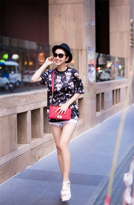 Áo thun phom rộng với họa tiết in hoa không chỉ tôn lên vẻ đẹp nữ tính ngọt ngào mà còn giúp cô trông năng động, trẻ trung hơn khi xuống phố.