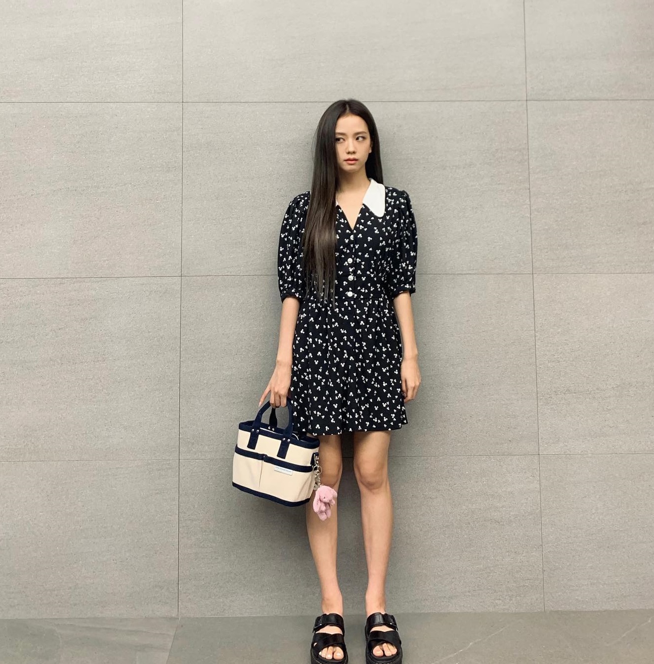 Diện váy tông màu đen và trắng nhưng Jisoo trông vẫn rất trẻ trung, ngọt ngào. Cô nàng đã tăng sự nổi bật cho bộ trang phục bằng một đôi sandal đế thô. Chiếc túi xách màu trung tính ăn nhập hoàn hảo với tổng thể outfit.