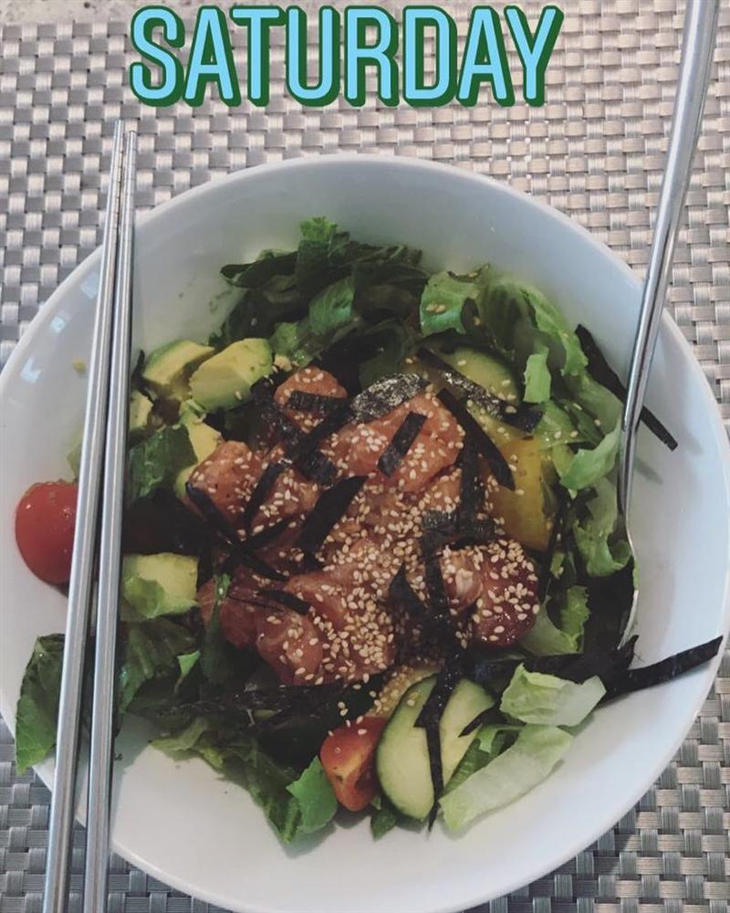 Ngoài liệu trình detox, Kaity Nguyễn còn rất tích cực ăn kiêng tinh bột, tăng cường chất xơ. Salad là món ăn thường gặp nhất trong thực đơn của mỹ nhân 'Em chưa 18'. Cô thường dùng các loại rau xanh, dưa chuột, cà chua bi trộn cùng một chút thịt nạc, hạn chế sử dụng sốt.