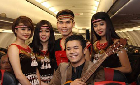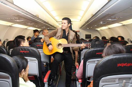 Tiết mục độc đáo lần đầu tiên được trình diễn trên máy bay của hãng hàng không VietJetAir đã khiến các hành khách trên chuyến bay vô cùng thích thú.