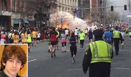 Dzhokhar Tsarnaev (ảnh nhỏ) và hiện trường vụ đánh bom cuộc thi Boston Marathon đẫm máu năm 2013. Ảnh: Express |
