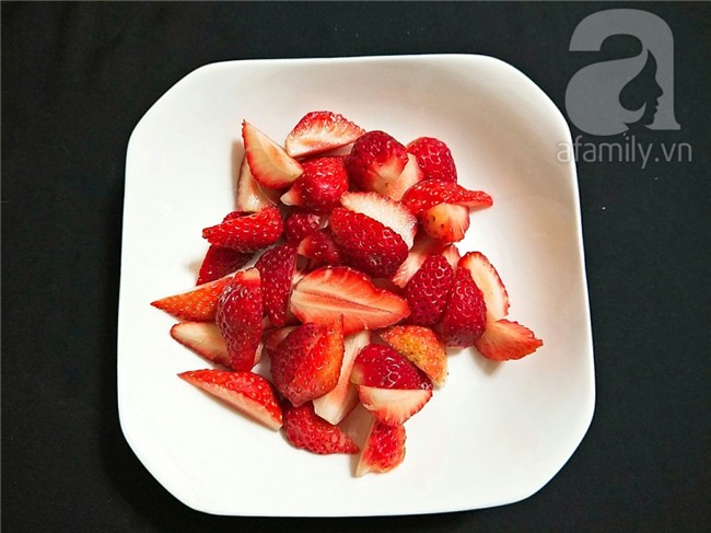 Dâu tây cắt cuống rửa sạch sau đó cắt làm 4 rồi cho vào máy xay sinh tố xay nhuyễn. Bột bắp và bột năng, 1 thìa nước cho vào bát khuấy đều cho tan.