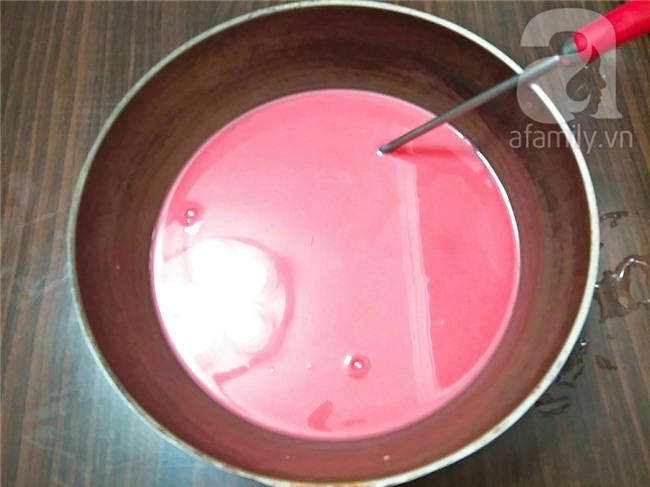 Cho sữa tươi, kem tươi, nước cốt dừa, sữa đặc, đường vào nồi và khuấy đều sau đó bật bếp nấu cho hỗn hợp gần sôi thì cho nước bột năng vào khuấy đều cho tan và nồi sữa sủi bong bóng là tắt bếp, cho dây tây xay nhuyễn vào khuấy đều.