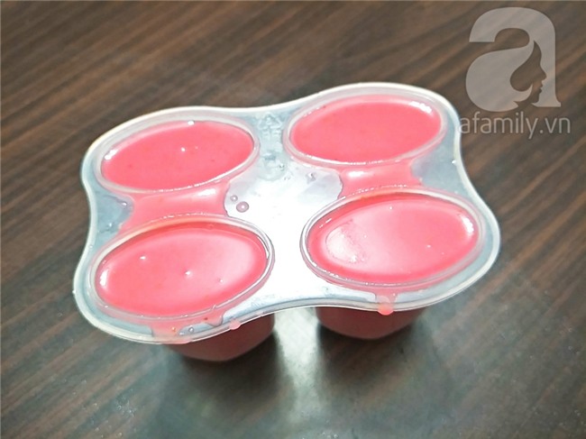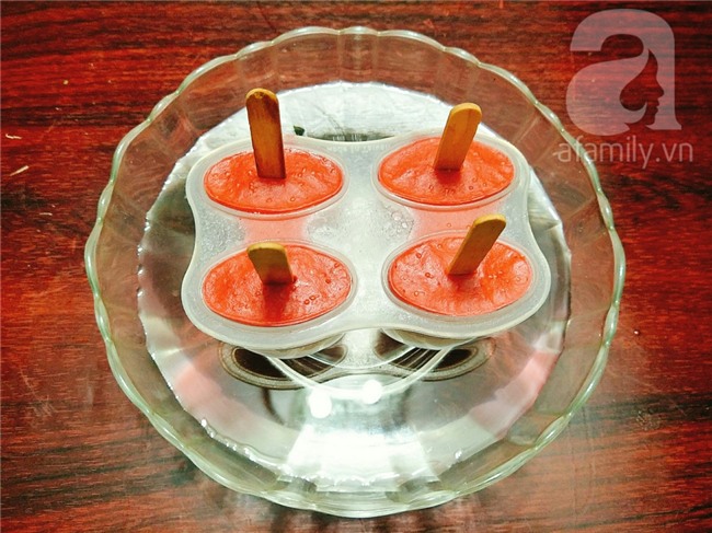 Để cho kem nguội bớt thì rót hỗn hợp chia đều vào khuôn kem, sau đó để cho kem nguội hẳn rồi cắm que kem vào, nếu bạn dùng loại que tre như trong hình thì phải cho kem vào ngăn đông khoảng 2 tiếng rồi mới lấy ra cắm que kem lên nhé.