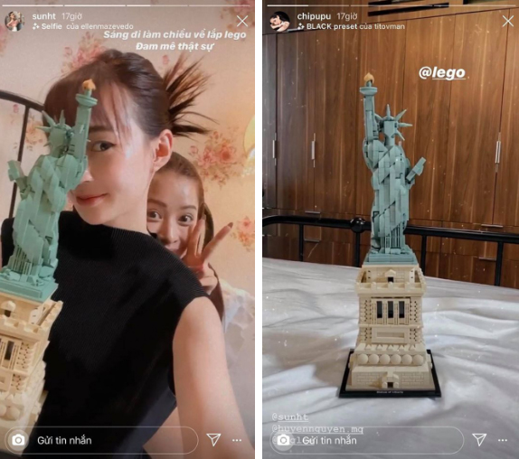 Trong một diễn biến khác, Chi Pu dạo này cũng thường xuyên ăn ngủ ở nhà SunHt. Lý do chỉ đơn giản là gần đây Chi quay ra mê mẩn chơi lego nên sang nhà người chị em ghép cùng cho vui. Thành quả mới đây nhất của họ là tượng Nữ thần tự do khá xịn sò.