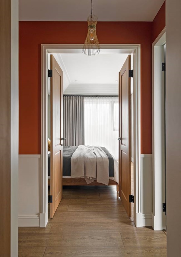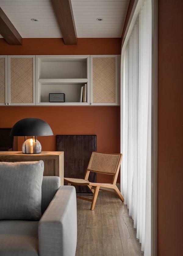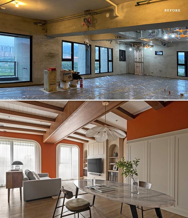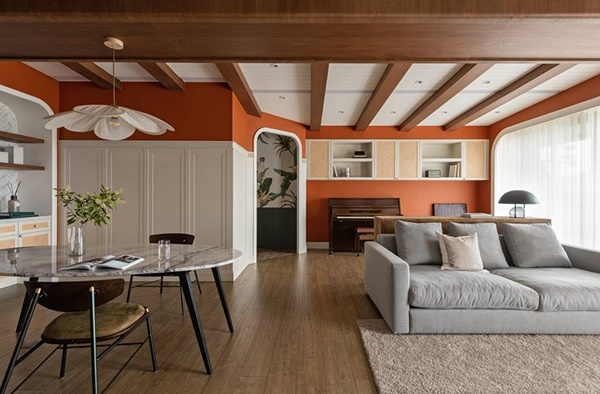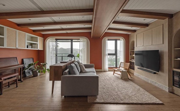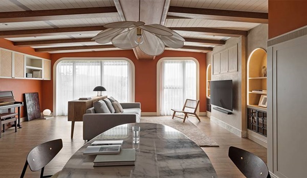 Bước vào không gian nhà đẹp đập vào mắt là màu cam sữa ấm áp tương phản với tầm nhìn màu xanh của ngọn đồi xa xa. Tuy rằng vách tường TV nhường một ít không gian phòng ngủ chính, che đi một phần mặt cửa sổ đối xứng nguyên bản, vẫn là phác ra khung cửa sổ tròn trịa, cửa sổ lớn nhỏ tích hợp phương thức xem khung, ghế sô pha cũng tránh vị dưới chùm sáng, giúp cân bằng tầm nhìn một cách linh hoạt.