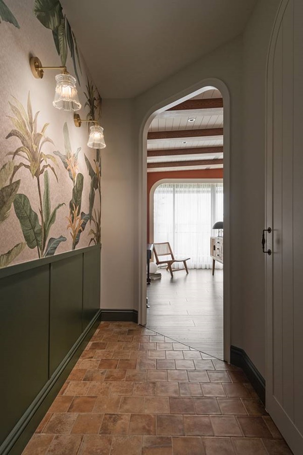 Căn hộ tạo được ấn tượng ngay từ khi bước vào bởi đường di chuyển xiên góc dẫn đến view cửa sổ tràn ngập ánh sáng mặt trời, đưa tầm nhìn ra khung cảnh núi non xanh tươi bên ngoài. Tủ để giày màu xanh lá kết hợp hài hoà với giấy dán tường hoạ tiết lá như bức tranh sống động, bình yên khi bước vào. Tủ giày bên phải cao kịch trần, vừa để được giày, vừa để được các vật dụng lớn như hành lý hay quần áo chưa dùng đến.