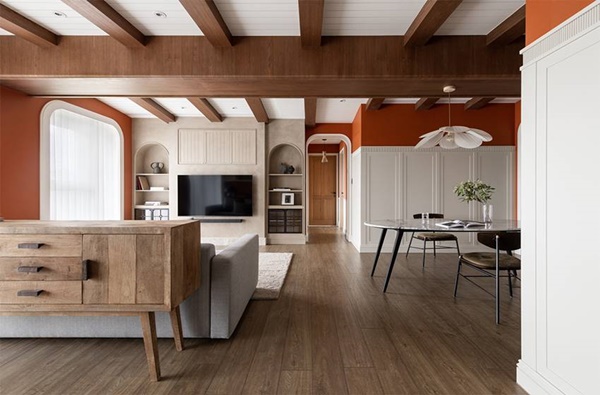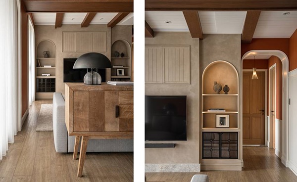 Khung tường tivi màu be sang trọng giúp hài hoà lại màu sắc so với màu cam ấm áp. Hai bên tivi là tủ ốp tường cổng vòm vừa để những vật dụng đơn giản vừa trang trí.