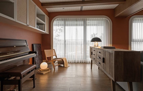 Chiếc tủ thấp phía sau ghế sofa xác định góc đa chức năng, trở thành chỗ dựa để thư giãn đánh đàn, đọc sách hay chơi game của gia đình. So với cách bài trí tường sách thông thường, tủ treo được sử dụng để giải phóng không gian trưng bày đàn piano. Các ô cửa mây tạo hiệu ứng thị giác nhẹ nhàng, thoáng đãng.