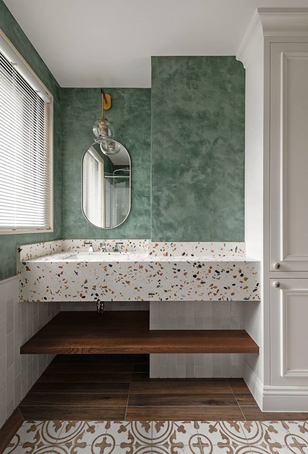 Thừa hưởng tông màu xanh lá cây nhẹ nhàng và ổn định của phòng ngủ chính, với sơn màu xanh lá cây đậm kết cấu được làm thủ công  tạo nên phong cách của phòng tắm chính. Phòng tắm được sử dụng gạch có nhiều hoạ tiết khác nhau như: gạch nung sống động, ngói thanh lịch, gạch vân gỗ ấm áp, tranh ghép khảm và gạch thủ công gradient thiết lập mỗi chức năng là độc lập nhưng có liên quan với nhau.