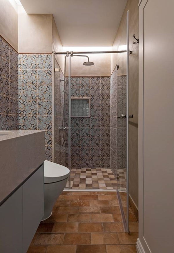 Phòng tắm dành cho khách ở khu vực chung cũng được trang trí bằng 4 loại gạch, sự đơn giản tự nhiên của đất sét được thể hiện qua màu sơn tường và gạch lát sàn.