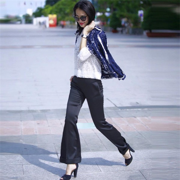 hút với quần âu ống loe mix cùng áo ren trắng và khoác ngoài hờ hững với