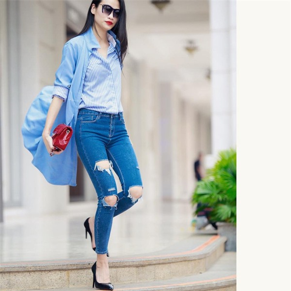 quen thuộc với sơmi và jeans rách diện cùng áo khoác mỏng manh xắn tay