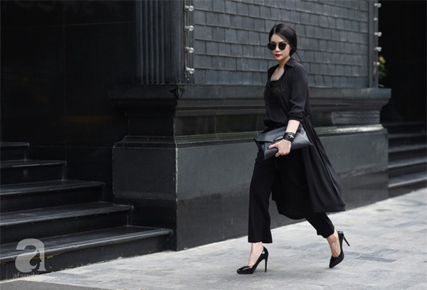 cạnh một set đồ đen đơn giản diện cùng áo khoác mỏng dáng dài thướt tha