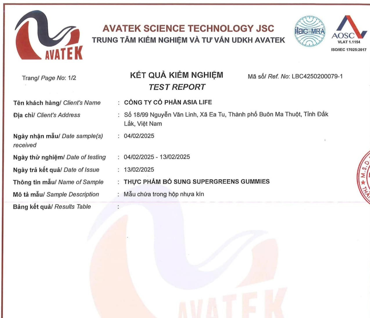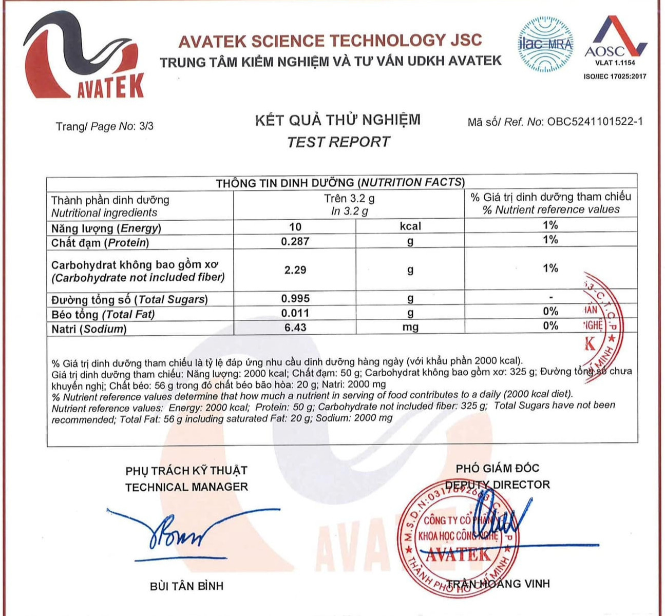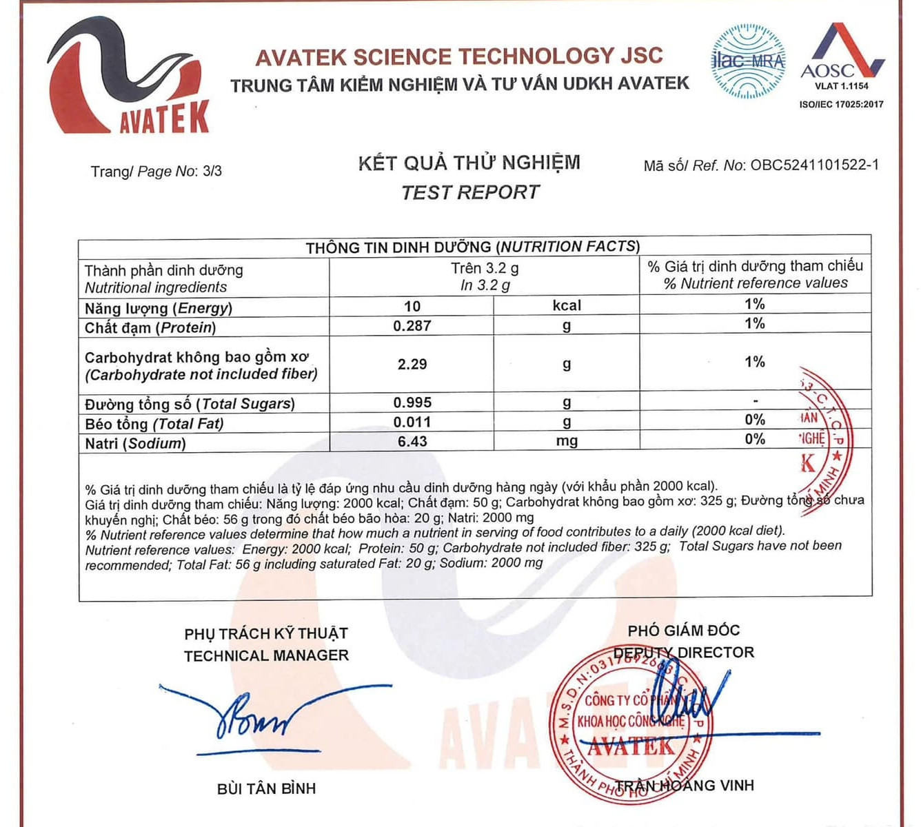 Theo Tiến sĩ về sinh học phân tử y học Nguyễn Hồng Vũ (nghiên cứu sinh tại Viện Nghiên cứu ung thư City of Hope, California, Mỹ), doanh nghiệp gửi mẫu xét nghiệm tới Trung tâm Kiểm nghiệm và tư vấn UDKH Avatec 2 lần với mục tiêu khác nhau. Lần 1, xét nghiệm để xác định 7 yếu tố gồm: Năng lượng (kcal), đạm, Carbohydrate (không bao gồm xơ), đường tổng (tính theo glucose), béo tổng (fat), Natri và xơ tổng. Còn lần thứ 2, nhà sản xuất chỉ xác định duy nhất Inulin.