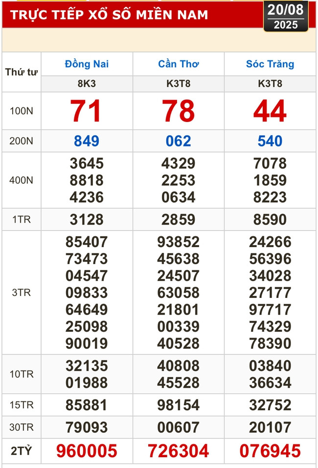 Kết quả xổ số hôm nay của xổ số kiến thiết miền Nam (XSMN): Đồng Nai, Cần Thơ, Sóc Trăng