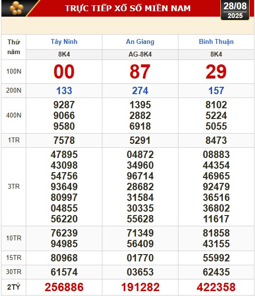 Kết quả xổ số hôm nay của xổ số kiến thiết miền Nam (XSMN): Tây Ninh, An Giang, Bình Thuận