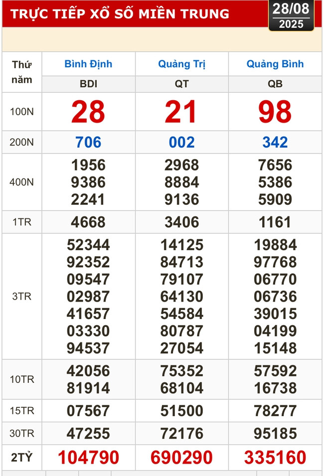 Kết quả xổ số miền Trung (XSMT): Bình Định, Quảng Trị, Quảng Bình