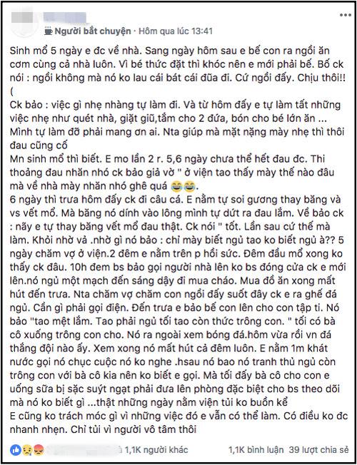Theo lời kể, sau 5 ngày sinh mổ chị được cho về nhà. Thế nhưng chẳng giống các sản phụ được chăm sóc cẩn thận lúc ở cữ, chồng chị nói “việc gì nhẹ nhàng tự làm đi”. Vậy nên những công việc như quét nhà, giặt giũ, tắm cho con lớn, cho con ăn... chị đều cố làm hết.