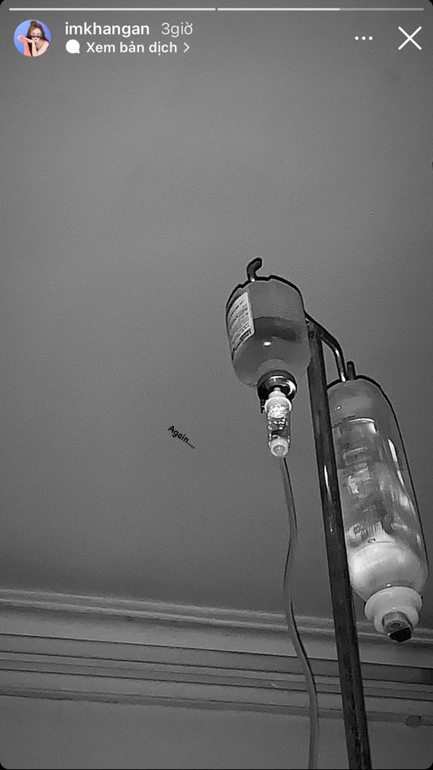 Hình ảnh nữ diễn viên tiếp tục phải truyền nước trong viện ngay giữa thời điểm dịch bệnh căng thẳng, khiến các fan cực kỳ lo lắng. "Again..." (Lại...), Khả Ngân viết trên trang cá nhân.