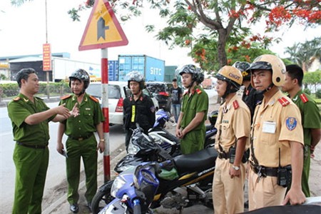 Đại tá Lê Hồng Thắng (ngoài cùng bên trái) chỉ đạo tuần tra đấu tranh với tội phạm trên QL5. |
