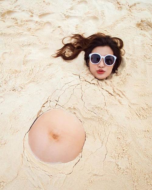 Dù đang ở cuối thai kỳ nhưng sức khỏe của Đông Nhi không hề bị giảm sút. Cô thường xuyên tham gia các hoạt động ngoài trời cùng ông xã. Trong bức ảnh mới nhất, còn hài hước chia sẻ: “Mẹ tính chụp bộ ảnh lăn trên đồi cát mà ba hông cho. Ba bắt đắp như này mới chịu.”