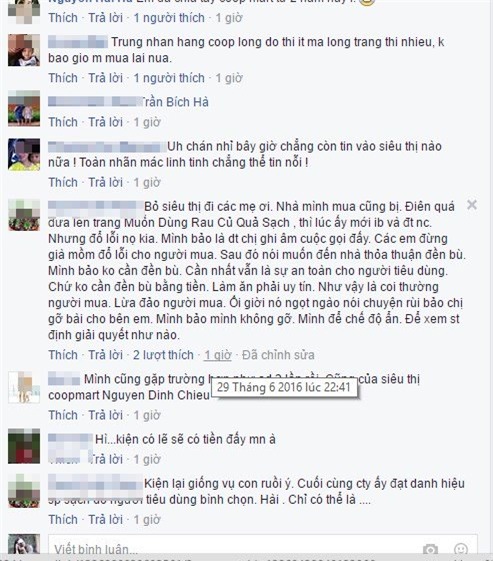 Chủ tài khoản này còn cho biết sau khi nhận được thông tin, siêu thị còn đổ lỗi cho người mua. “Nhà mình mua cũng bị. Điên quá đưa lên trang Muốn Dùng Rau Củ Quả Sạch, thì lúc ấy mới ib và điện thoại nói chuyện. Nhưng đổ lỗi nọ kia. Mình bảo là điện thoại chị ghi âm cuộc gọi đấy. Các em đừng già mồm đổ lỗi cho người mua. Sau đó nói muốn đến nhà thỏa thuận đền bù. Mình bảo không cần đền bù. Cần nhất vẫn là sự an toàn cho người tiêu dùng. Chứ không cần đền bù bằng tiền. Làm ăn phải uy tín. Như vậy là coi thường người mua. Lừa đảo người mua. Ối giời nó ngọt ngào nói chuyện rùi bảo chị gỡ bài cho bên em. Mình bảo mình không gỡ.”(tài khoản facebook T.A.P viết).
