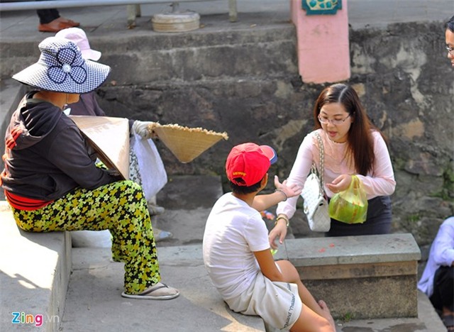 | Khi người lễ chùa xuống bến nước phóng sinh cá, những hành khất đứng "chặn" phía trên. Vì không muốn lôi thôi, nhiều người rút tiền bố thí để nhanh được "qua cửa". |