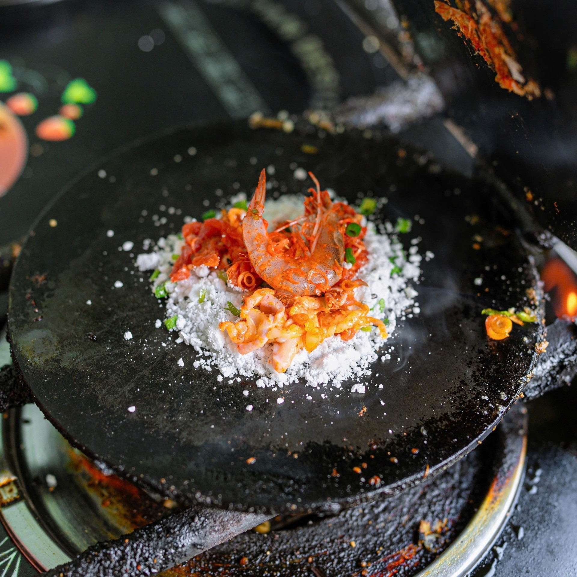 Có nơi, đầu bếp sẽ nặn bột thành những cục nhỏ, phía trên điểm thêm một chút thịt, hành lá rồi cho vào ép giữa 2 tấm gang nóng rực.