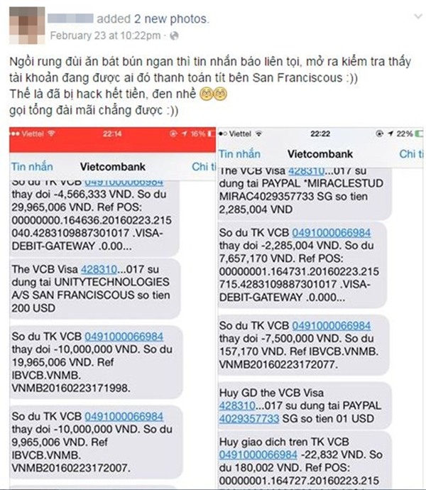 Dòng trạng thái trên được facebooker D.A đăng tải cùng hai bức ảnh chụp màn hình tin nhắn do phía ngân hàng Vietcombank báo về. Theo đó, số tiền trong tài khoản của D.A lần lượt bị rút với các mệnh giá khác nhau. Khi số tiền còn lại quá ít, phía người rút tiền không rõ danh tính tại Sanfranciscous tiếp tục rút từng đô la một cho đến khi cạn kiệt mới thôi.