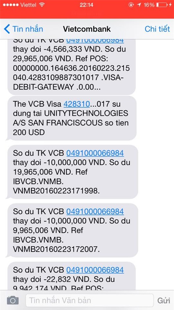 Trên trang cá nhân, nickname D.A chia sẻ câu chuyện của mình: "Đang ngồi rung đùi ăn bát bún ngan thì tin nhắn báo liên tục, mở ra kiểm tra thấy tài khoản đang được ai đó thanh toán tít bên Sanfranciscous. Thế là đã bị hack hết tiền, đen nhỉ. Gọi tổng đài mãi chẳng được".