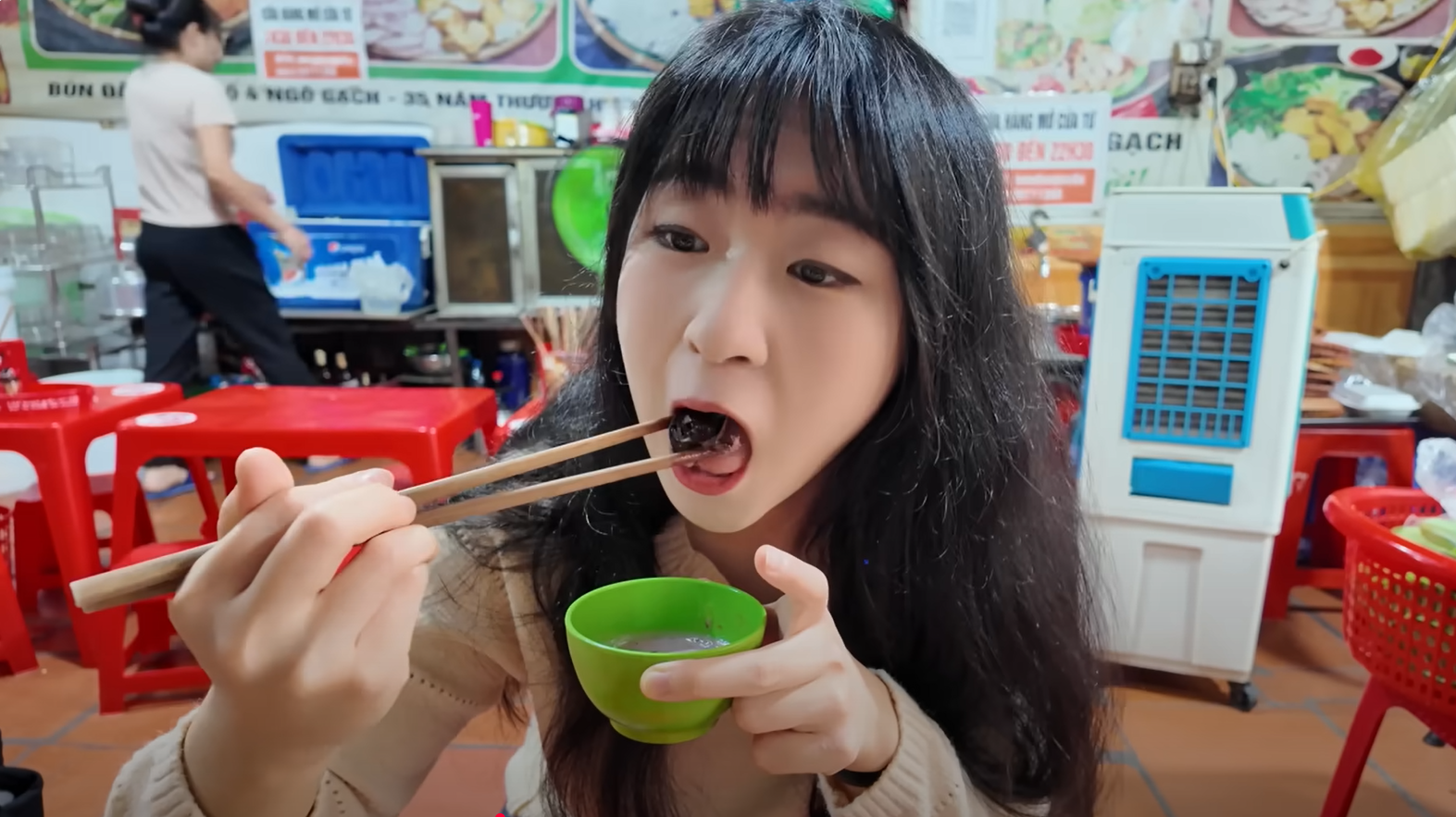 Khi các nguyên liệu nóng hổi được bưng ra, cô trầm trồ khen món bún đậu có mùi thơm và hình thức hấp dẫn. Cô tỏ ra thuần thục, sành ăn như người bản địa khi vắt quất, thêm ớt, đường vào bát mắm tôm rồi đánh đều cho sủi bọt lên.