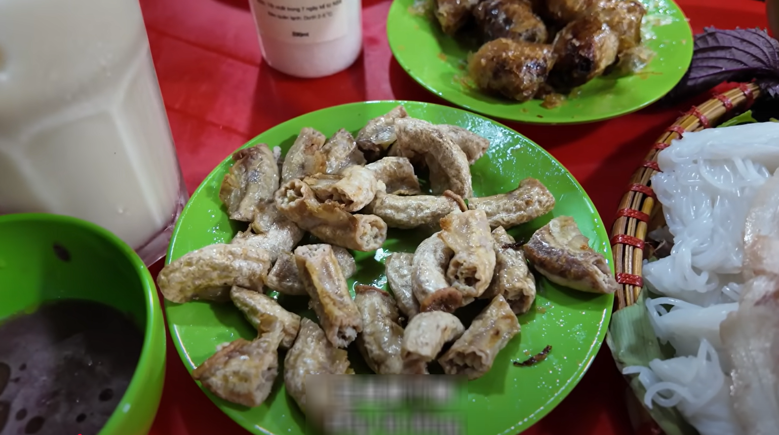 Tại đây, cặp đôi gọi 1 suất bún đậu thập cẩm (gồm bún, đậu, rau thơm, thịt chân giò luộc, chả cốm, lòng dồi), thêm đĩa lòng rán và đĩa chả nem.