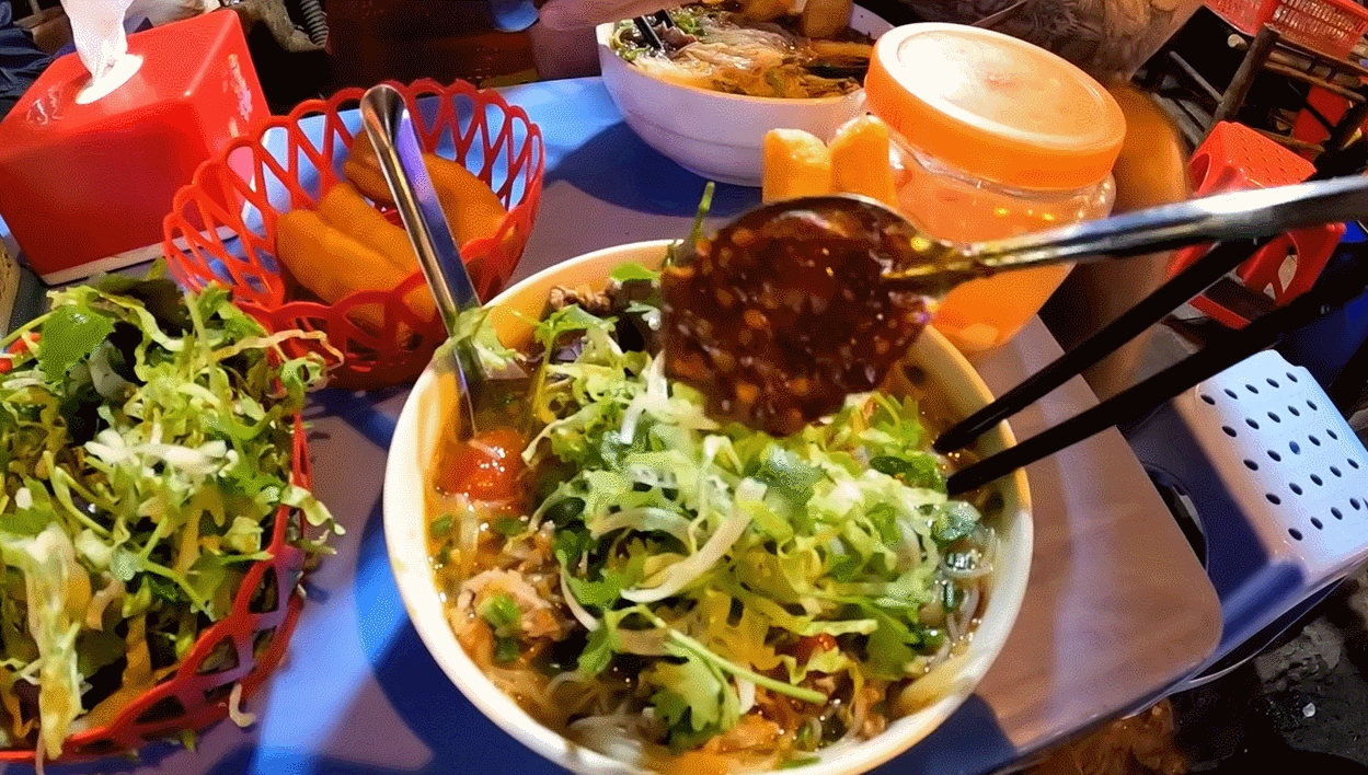 Diggy nhận xét hương vị món bún bò ở quán vỉa hè này không khác biệt so với lần đầu cô thưởng thức