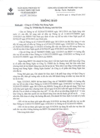 Thông báo của ngân hàng BIDV về lãi suất cho vay |