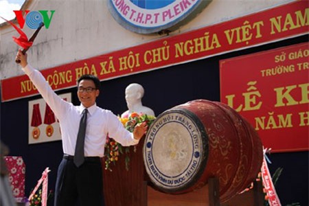 Phó Thủ tướng Vũ Đức Đam đánh trống khai giảng năm học mới tại trường THPT Pleiku năm học 2014. Ảnh: VOV