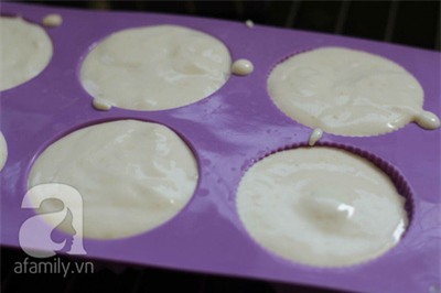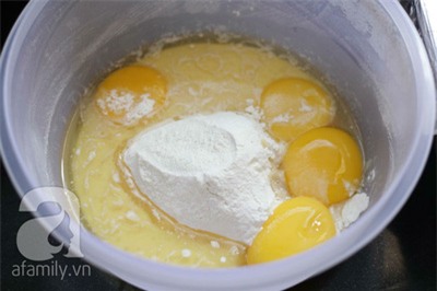![]() | ![]() Cho bột mì, bột bắp, lòng đỏ, sữa tươi, dầu ăn vào một tô lớn sau đó dùng phới lồng trộn đều hỗn hợp. |