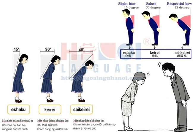 3 kiểu cúi chào cơ bản của người Nhật. Ảnh Ngoại Ngữ Hà Nội.