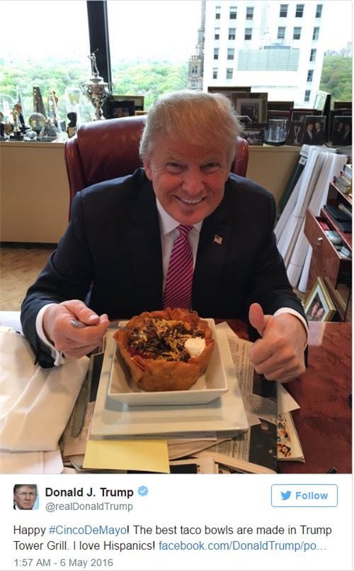 2. Taco: Tổng thống thứ 45 của Mỹ cũng từng tweet một bức ảnh ông đang thưởng thức một bát taco ở Trump Tower Grill.