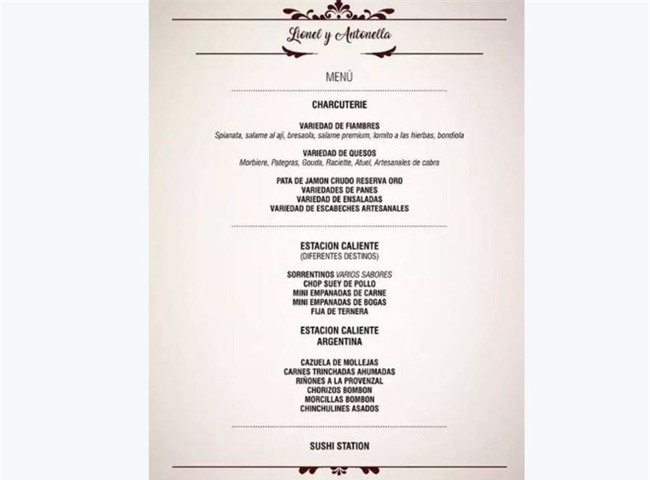 Thực đơn trong tiệc cưới của Messi và Antonella, với nhiều món ăn đặc trưng của địa phương. Menu bắt đầu với một loạt loại thịt, pho mát, jambon, bánh mì, salad. Với bánh mỳ, Messi bố trí riêng một thợ làm bánh ngay tại lò để phục vụ. Tiếp theo, khách mời có thể lựa chọn nhiều hương vị khác nhau như gà, bánh nhân thịt và thịt bò, bên cạnh các món ăn đặc sản của Argentina như mề áp chảo, hun khói carvery, dồi lợn nướng, xúc xích và bánh pudding.