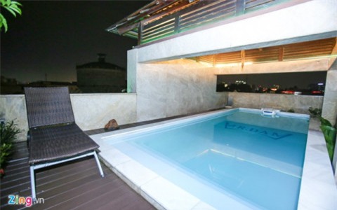 Sân thượng được Mr. Đàm dựng hồ bơi và trang trí nhiều tiểu cảnh, cây xanh tạo không khí mát mẻ, thư giãn.
