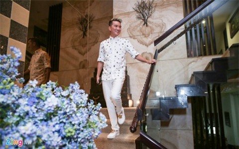 lên cầu thang được "ông hoàng nhạc Việt" trang trí nhiều hoa. Anh chia