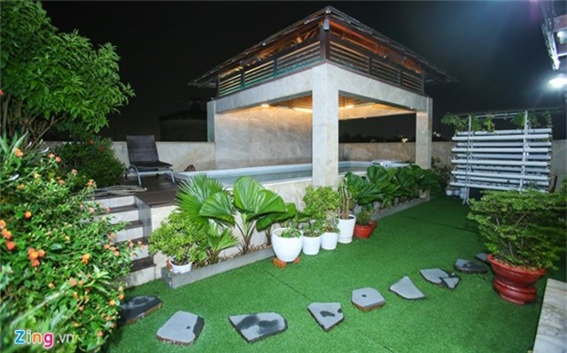 Sân thượng được Mr. Đàm dựng hồ bơi và trang trí nhiều tiểu cảnh, cây xanh tạo không khí mát mẻ, thư giãn.