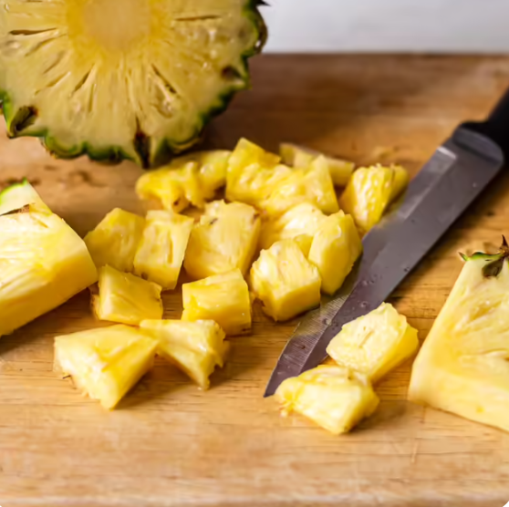 Bước 2: Dứa gọt vỏ, bỏ mắt, cắt thành các miếng nhỏ. Nếu dính phần lõi xơ ở giữa cũng nên bỏ. Để thay thế dứa, bạn có thể dùng đu đủ hoặc xoài chín kèm chút nước cốt chanh. Điều này phụ thuộc vào sở thích của bạn.