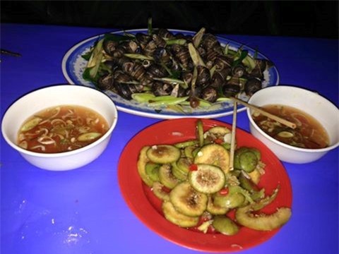Ốc đường Nguyễn Khánh Toàn: Chủ quán biến tấu nhiều món ốc đậm đà, ngon ngọt: ốc luộc, ốc xào me, nước chấm, nem chua rán giòn tan, đĩa đầy đặn. Kèm sung, khế muối, nhấm nháp cốc trà đá là bạn có thể ngồi tán gẫu hàng giờ với bạn bè. Ảnh: Hồng Hạnh.
