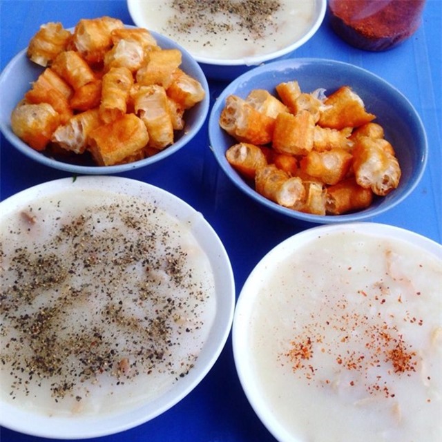 Cháo trai: Cháo trai Nghĩa Tân là cái tên khá nổi tiếng với dân mê quà vặt Hà Nội. Quán thu hút mọi lứa tuổi, từ trẻ đến già. Cháo trai vừa nóng hổi lại ngon, thơm, nhiều trai và bột xay mịn, ăn với quẩy giòn rất vừa miệng, giá 15.000 đồng một bát. Ảnh: Vũ Hương Giang.